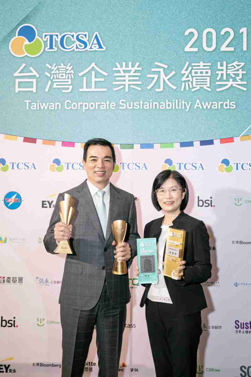 达在台湾永续奖所评比环境、、、、社会、、、、治理等各面向的永续绩效均获高度肯定 (左:赏金国际光电总经理暨营运长柯富仁,,,右:赏金国际光电永续长古秀华)