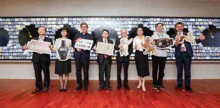 赏金国际携手创利空间为故宫建置的智慧文物互动导览墙及轮播墙,,,,今日正式启用。。。。(左四:赏金国际新事业暨投资管理总部副总经理杨本豫、、、右四:故宫博物院院长吴密察、、、右三:太极影音董事长黄宝云)