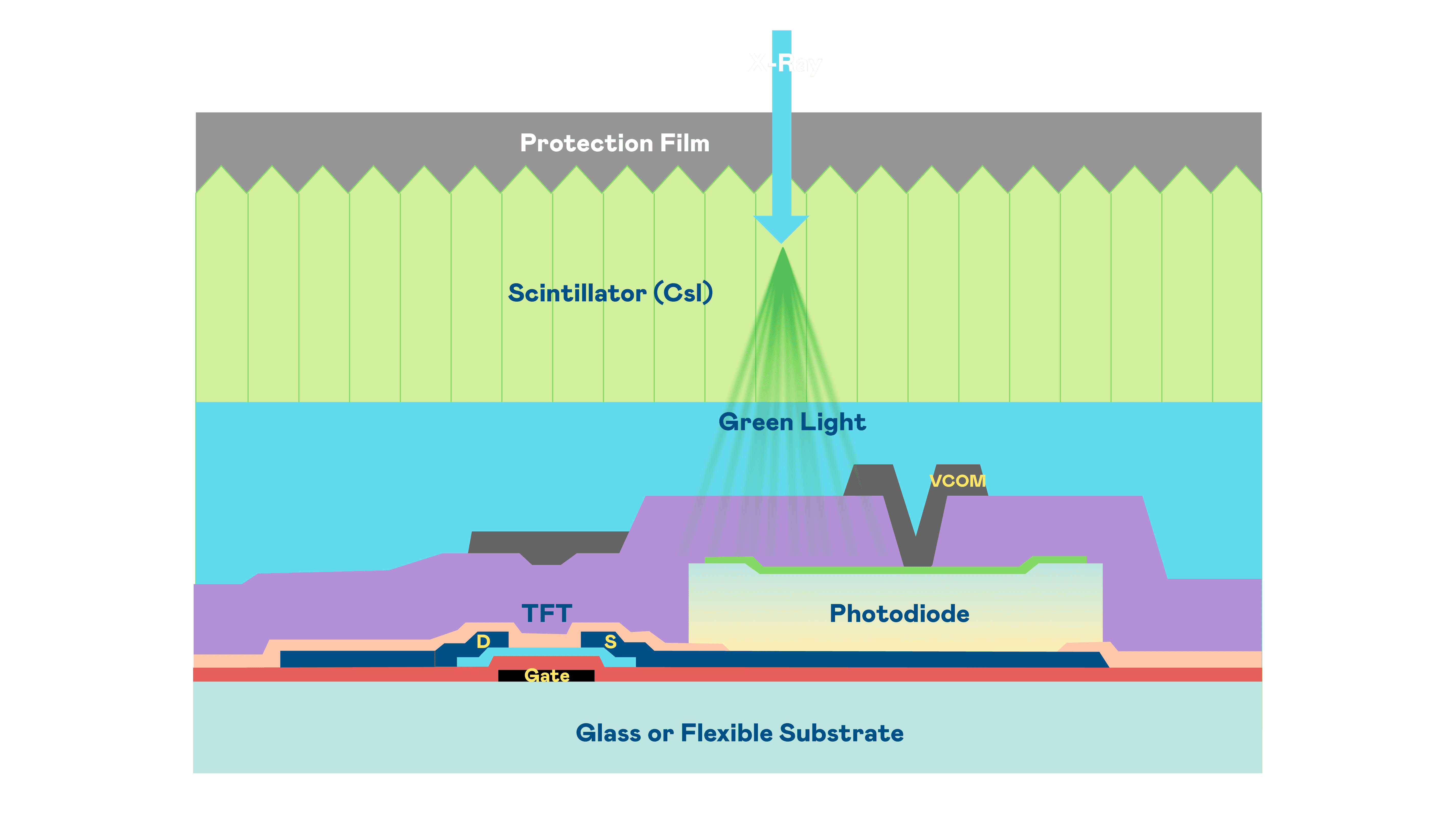 赏金国际的X光影像感测阵列使用薄膜电晶体 (TFT) 作为每个像素的读取开关,,搭配光电二极体(Photodiode)的光电转换元件,,,,用以感测X光影像讯号。。。
